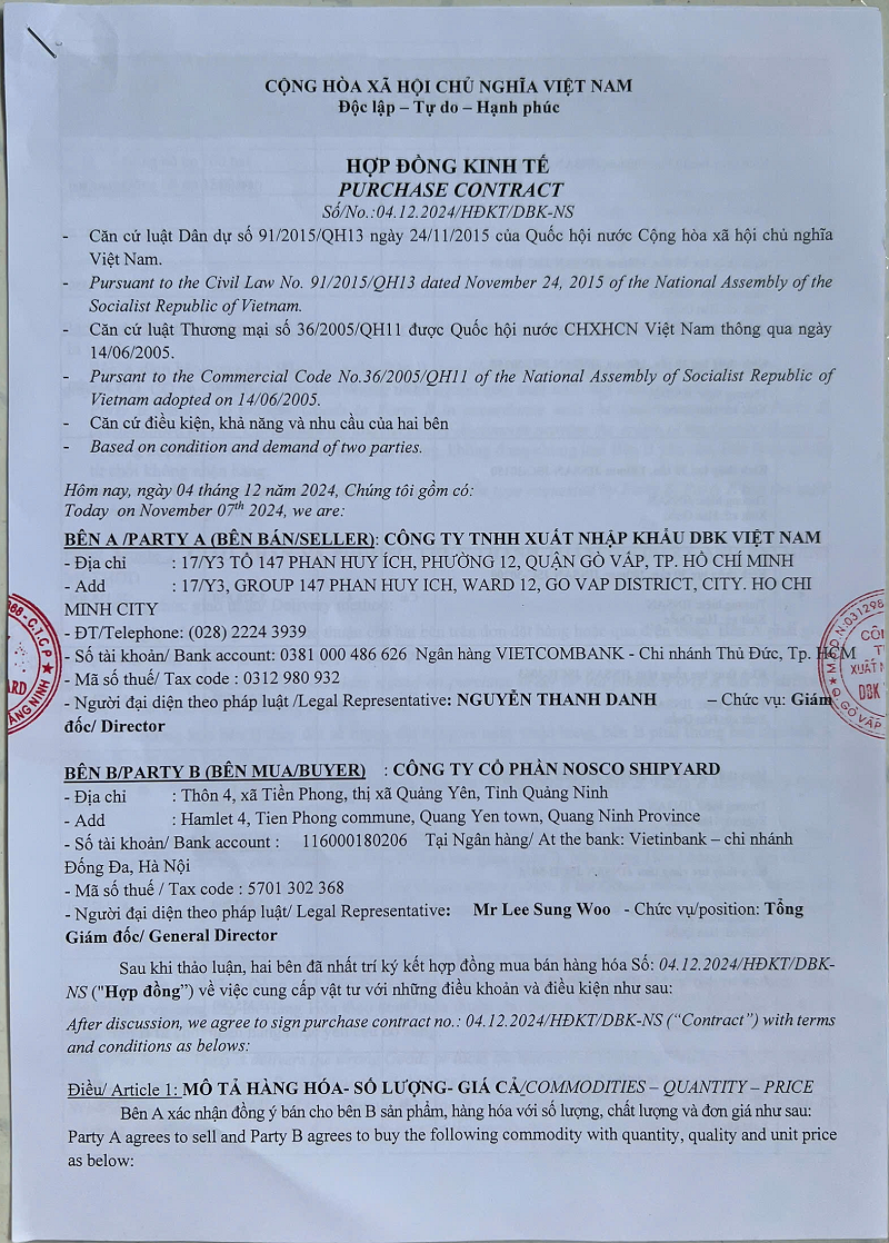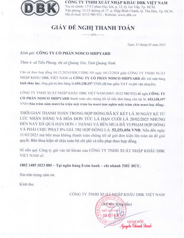 Theo nội dung hợp đồng mua bán đã ký kết giữa hai bên, phía NOSCO SHIPYARD đã đặt mua hàng hóa và dịch vụ từ công ty chúng tôi, với thời hạn thanh toán rõ ràng. Tuy nhiên, sau khi nhận hàng và nghiệm thu đầy đủ, công ty này đã nhiều lần chậm trễ thanh toán, vượt quá thời gian cam kết trong hợp đồng.