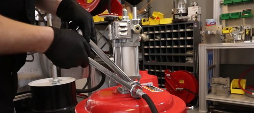 Lắp chặt nắp bình chứa, đảm bảo tấm ép mỡ nằm đúng vị trí, giúp duy trì áp lực ổn định khi bơm.